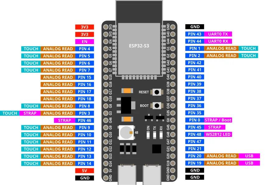 Most of the pins on the ESP32 can be used for inputs and outputs. Unlike the ESP32, the ESP32-S3 has no input only pins; all pins are capable of output.