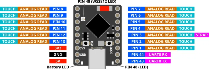 | BOOT | This button is connected to Pin 9. Pin 9 will return a 0 (LOW) when the button is pressed, and 1 (HIGH) when it is not. |