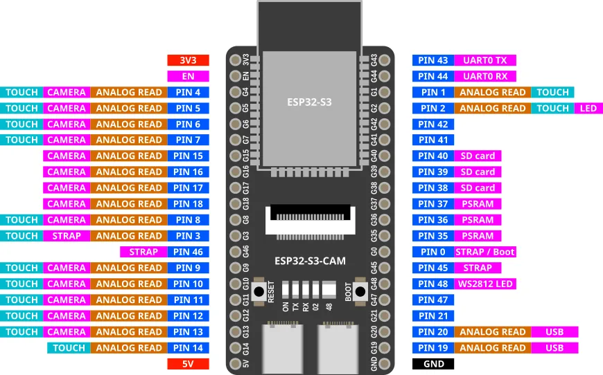 There are many varients of the ESP32-S3-Cam with different pinouts. This is for the Freenove (...and clones) version. Many of the pins have special uses, so check the table below before choosing a pin to use.